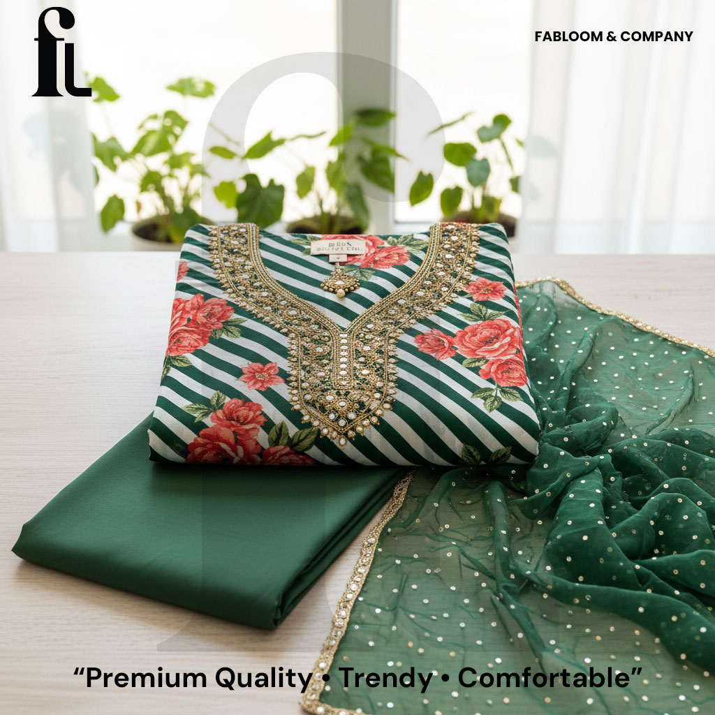 Fabloom & Company emphasizes meticulous craftsmanship and quality, ensuring each piece meets the highest standards. The suit set is easy to care for—simply dry clean to preserve its vibrant colors and fine detailing. Whether you are attending a wedding, a family function, or seeking a stylish outfit for a casual day out, this premium green floral suit set delivers elegance, versatility, and enduring comfort, making it an indispensable addition to your wardrobe.