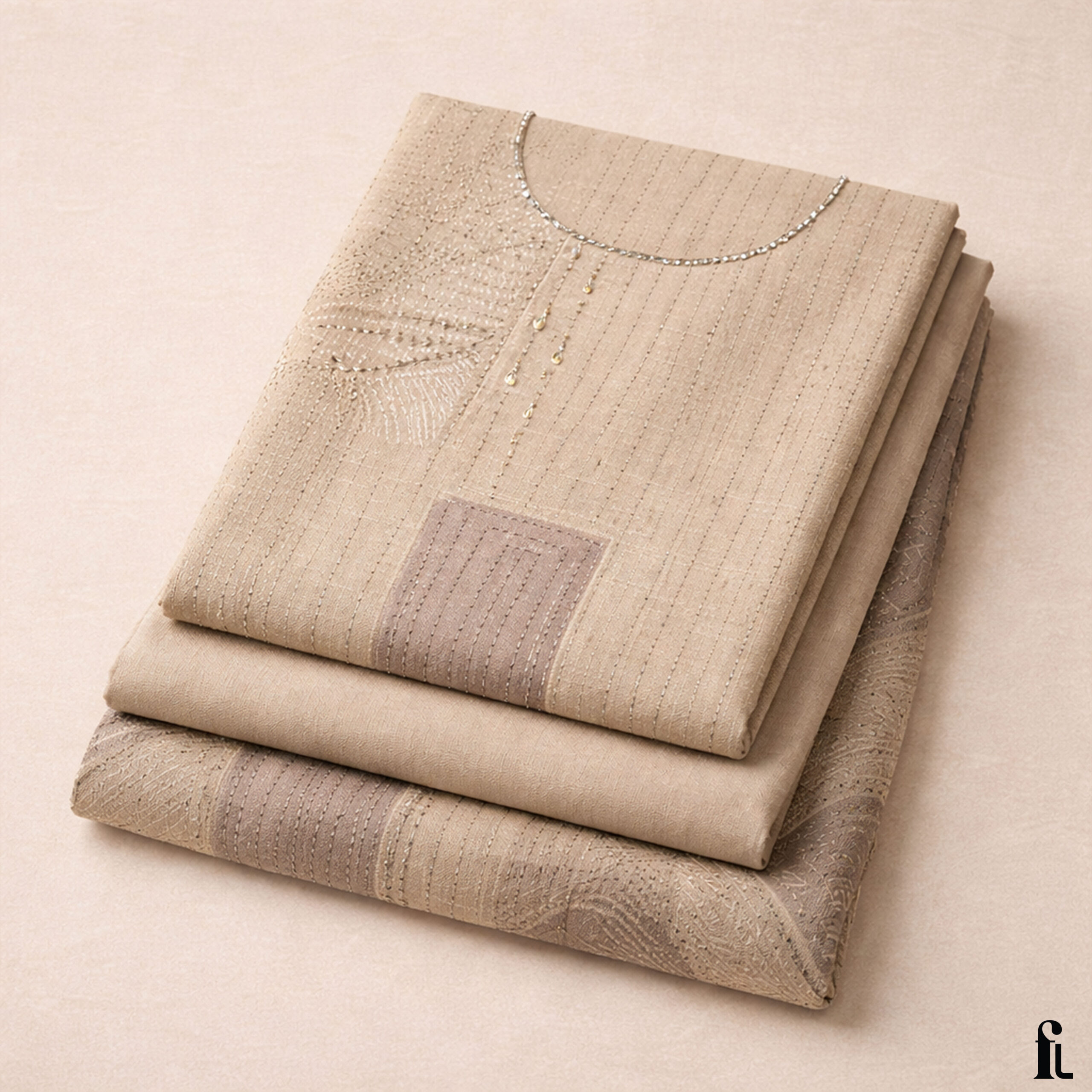 Elevate your wardrobe with this Fabloom Beige Embroidered Suit Set, crafted for a refined and premium look.