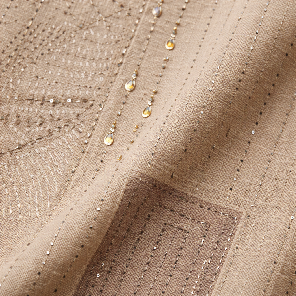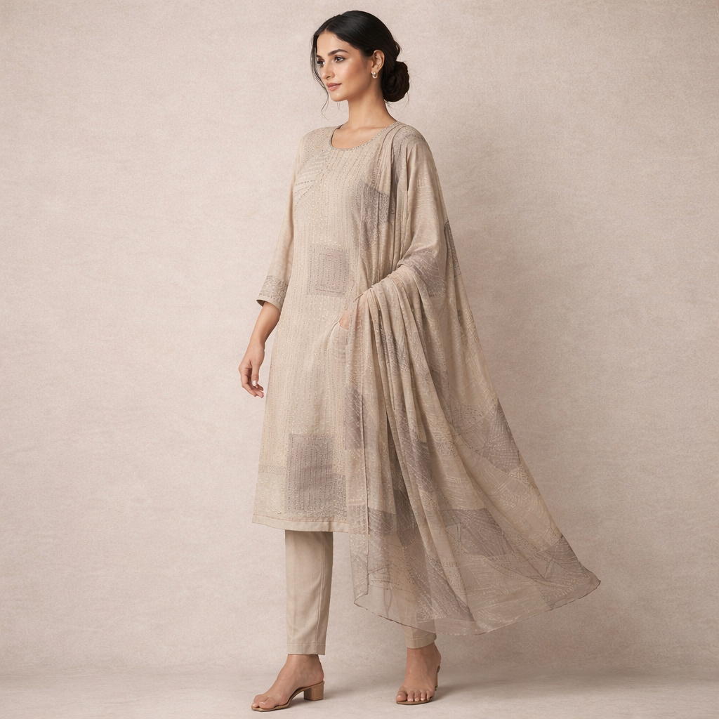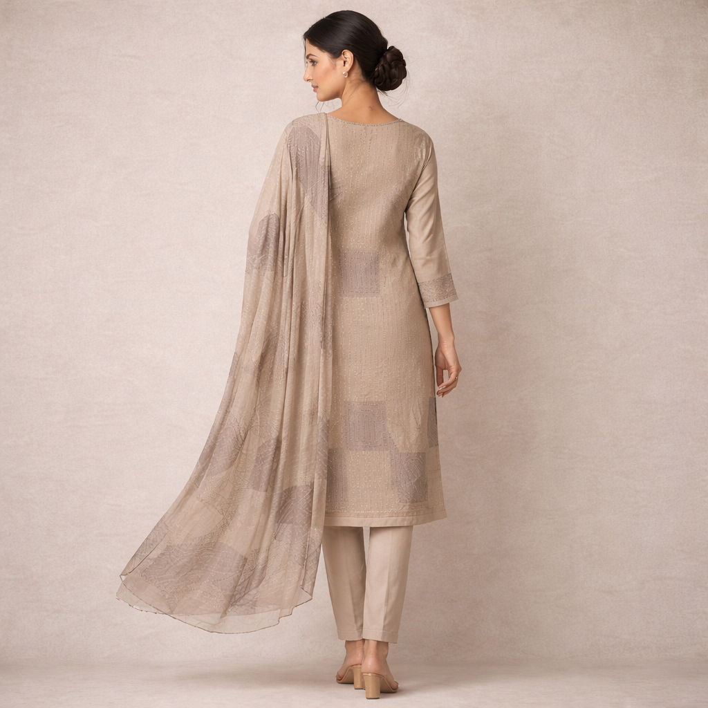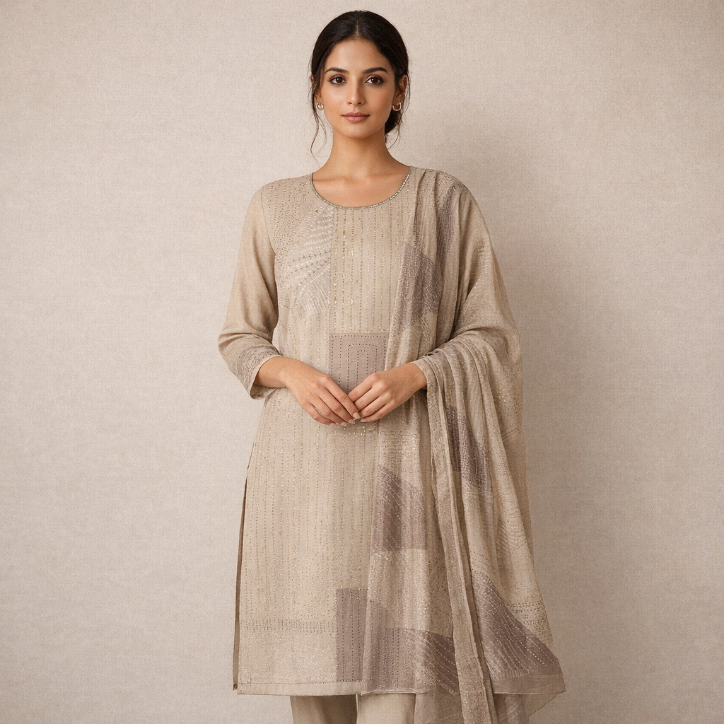 The soft neutral beige tone combined with delicate embroidery and subtle sequin work creates a sophisticated aesthetic. The intricate neckline design adds elegance, while the lightweight fabric ensures comfort throughout the day.