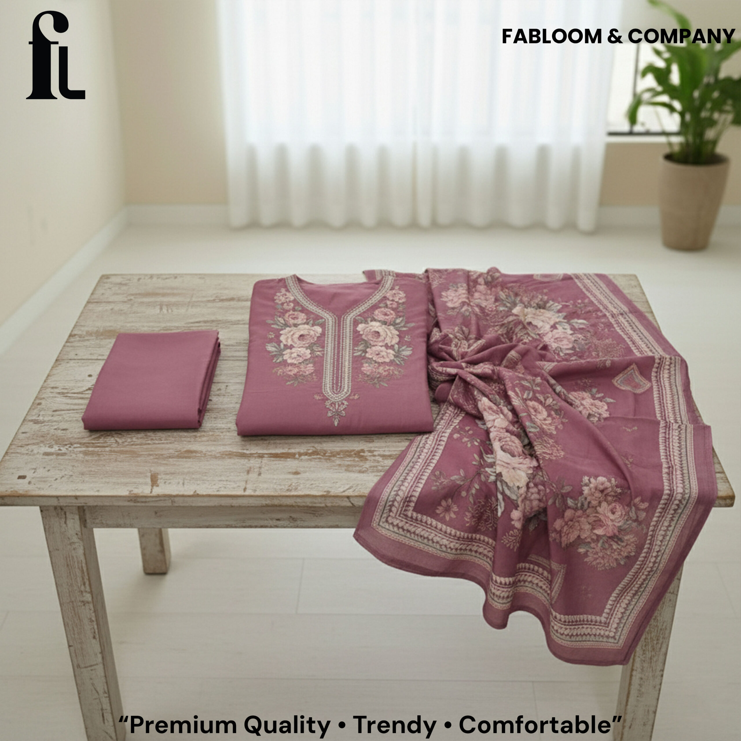 Stay warm in style this winter with our Premium Pashmina Woollen Suit from Fabloom & Company. Designed in an elegant Rosewood Mauve tone, this winter suit features a beautifully printed floral pattern with a classy neckline detailing — perfect for weddings, office wear, gatherings, or daily winter styling.