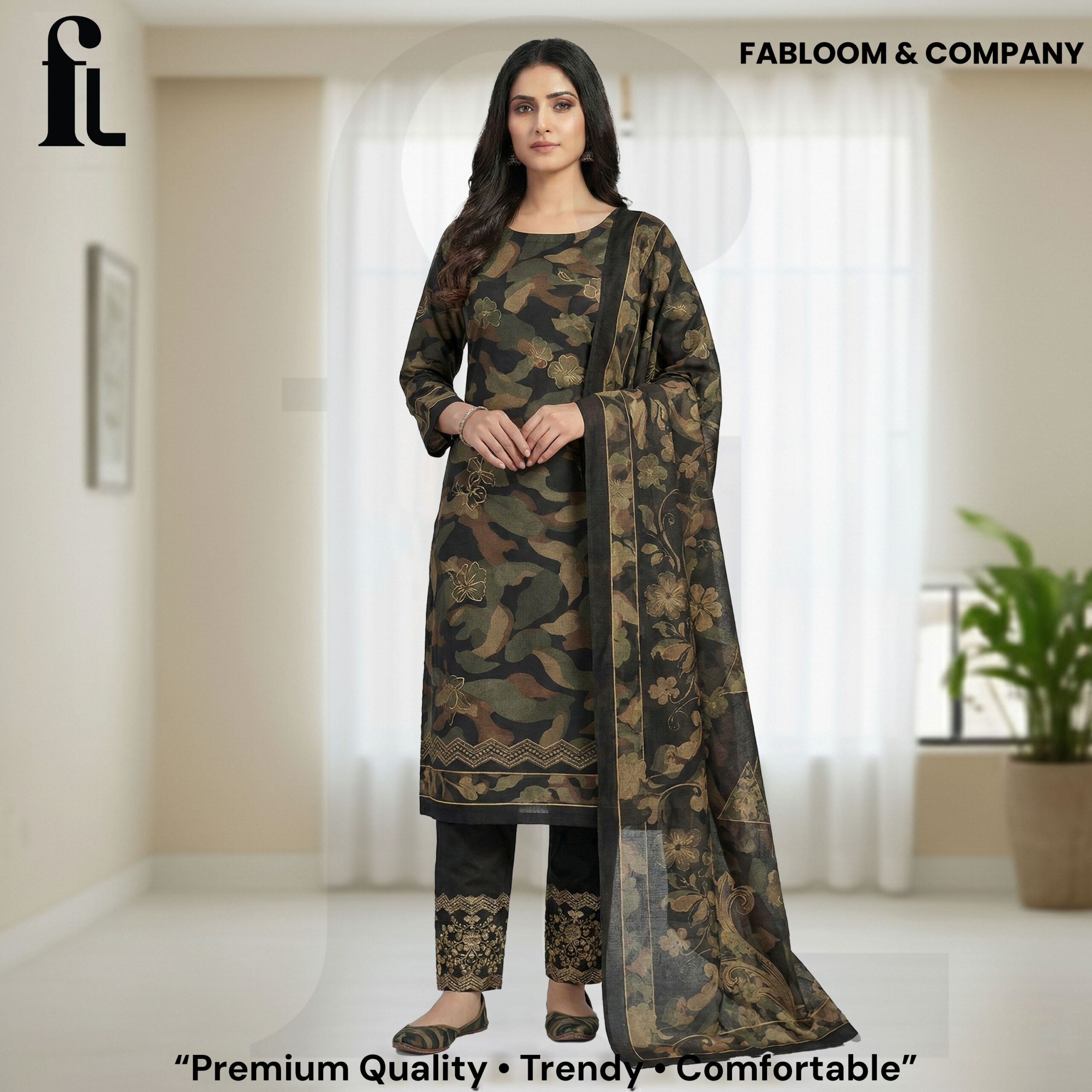 Step into effortless winter elegance with this Fabloom & Company Premium Winter Suit Set, designed for comfort, warmth, and everyday sophistication. Featuring a rich olive-black camouflage inspired base blended with subtle floral motifs, this unstitched winter suit offers a perfect balance of modern trend and traditional charm.