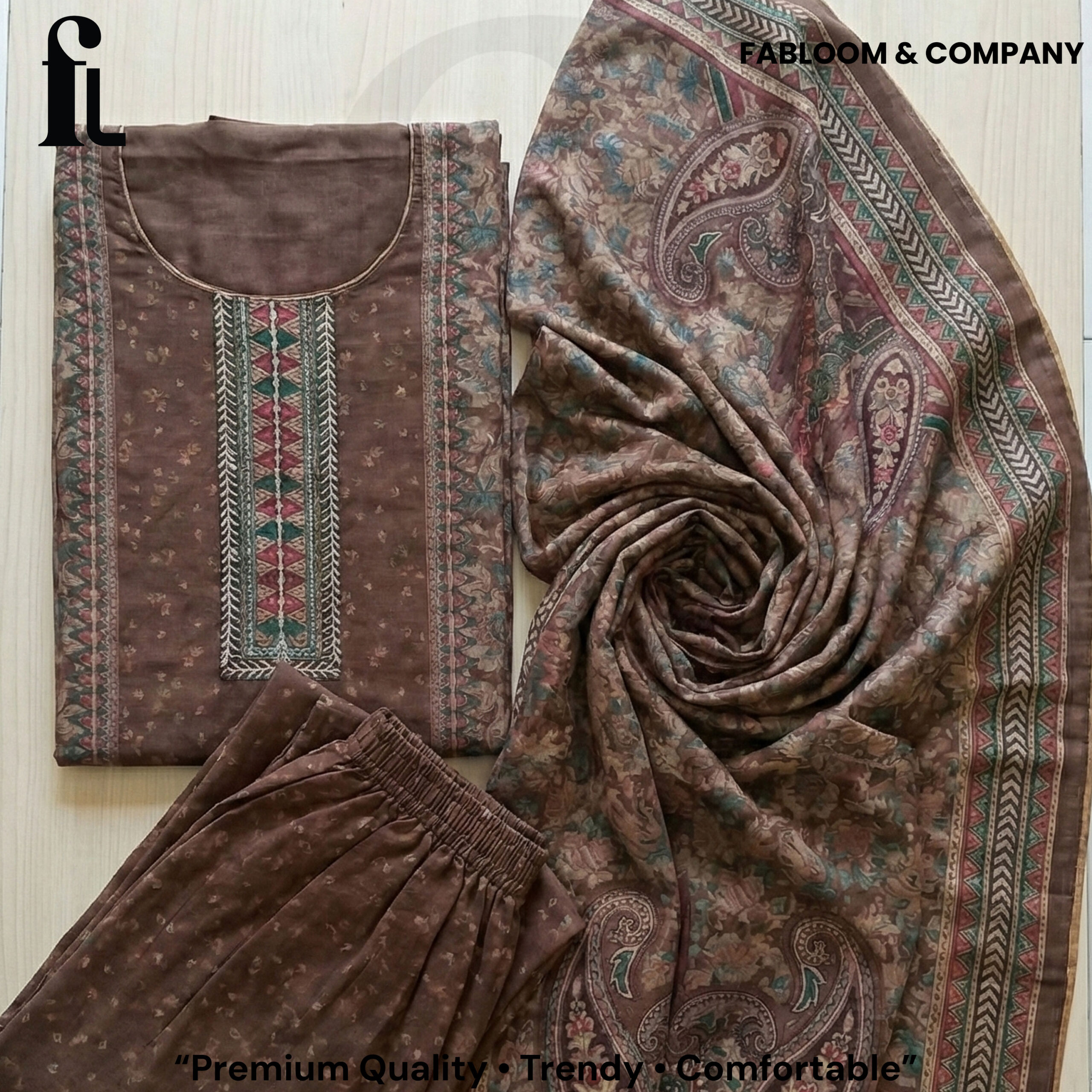 Add warmth and elegance to your winter wardrobe with Fabloom & Company’s Premium Winter Unstitched Suit Set in Classic Brown. Designed in rich earthy tones, this suit showcases detailed floral and paisley-inspired prints combined with beautifully structured borders that enhance its ethnic appeal.