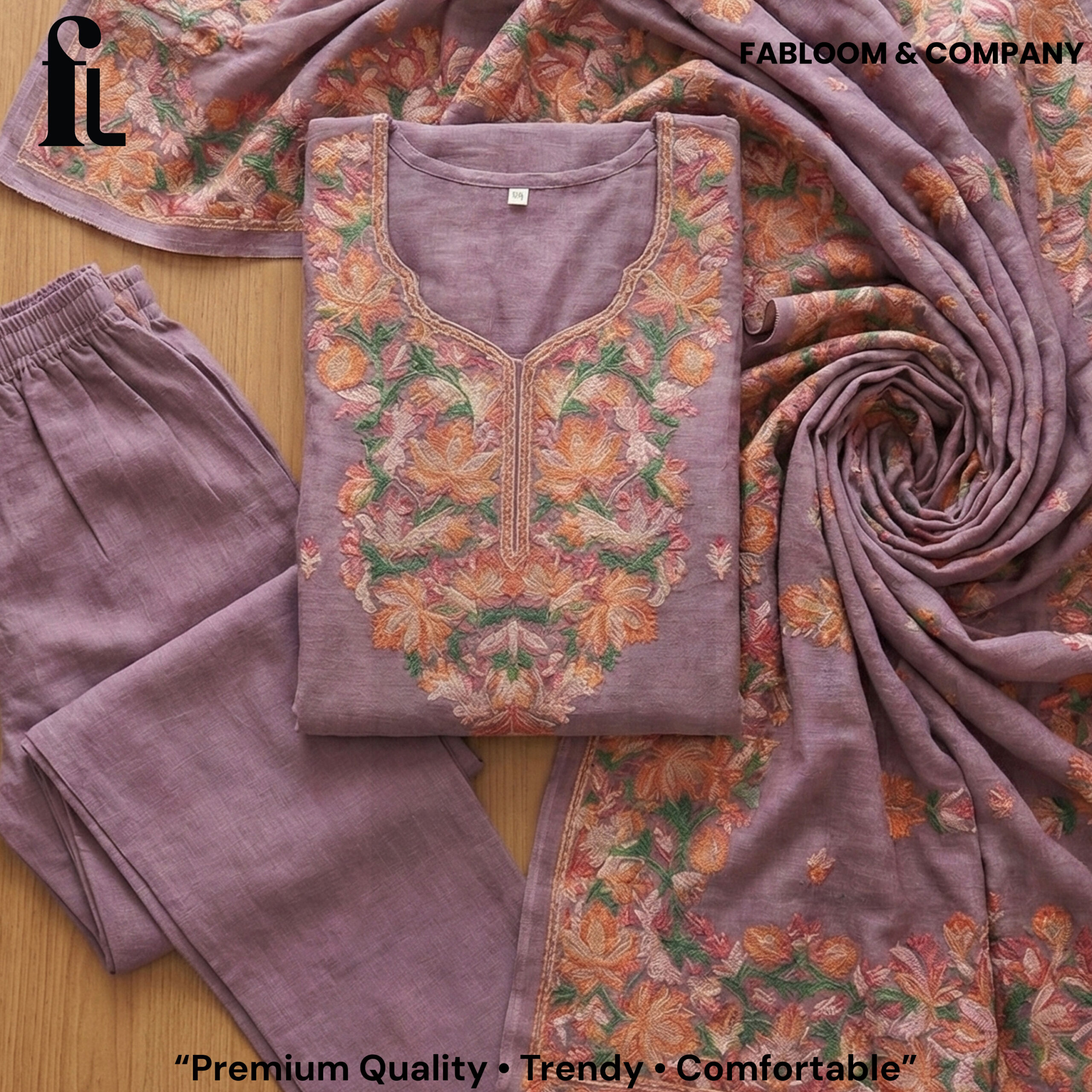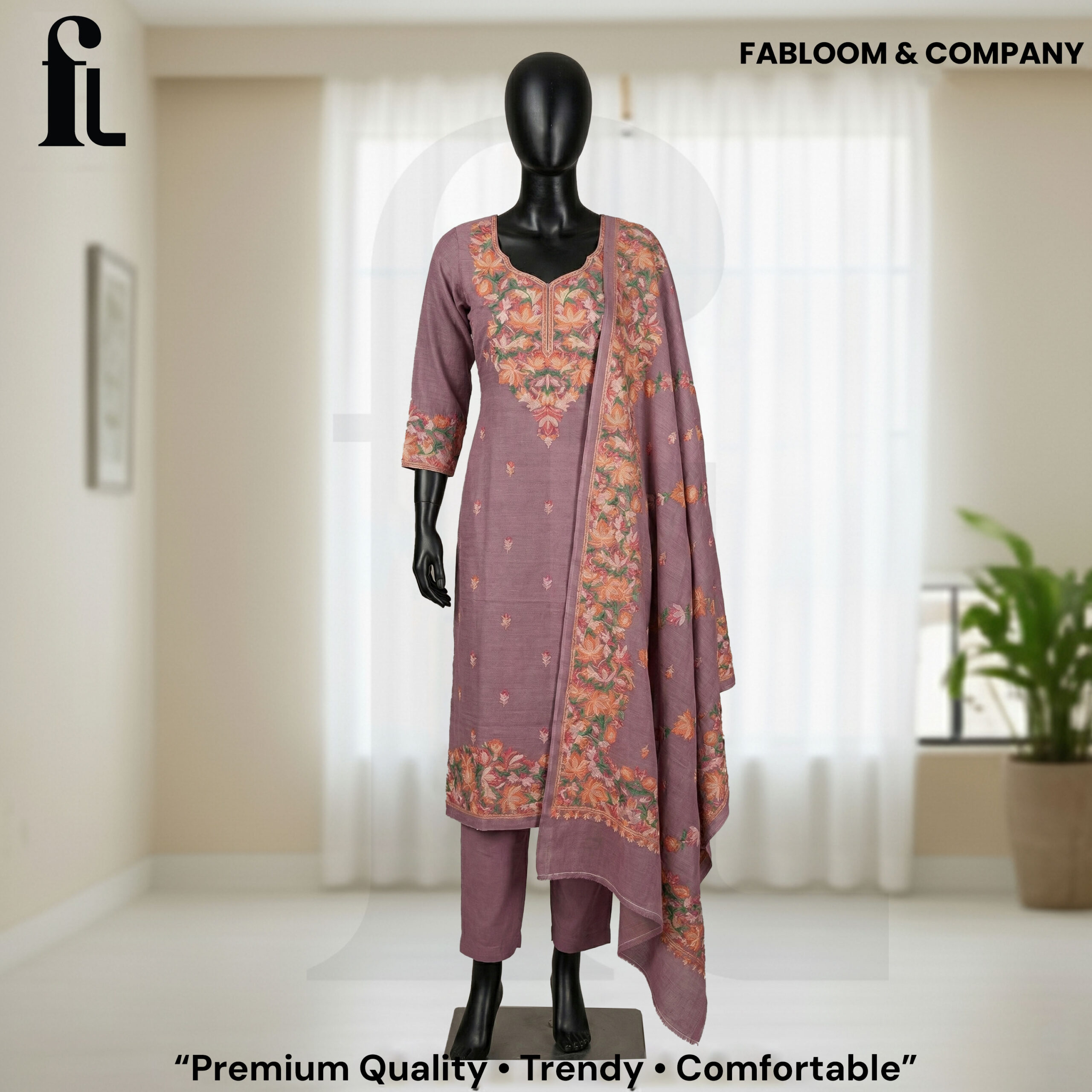 Bring subtle elegance to your winter collection with Fabloom & Company’s Premium Winter Unstitched Suit Set in Elegant Mauve Lilac. This suit features a soft lilac-mauve base beautifully enhanced with rich floral embroidery-style prints across the neckline, dupatta, and hemline, creating a graceful and feminine look.