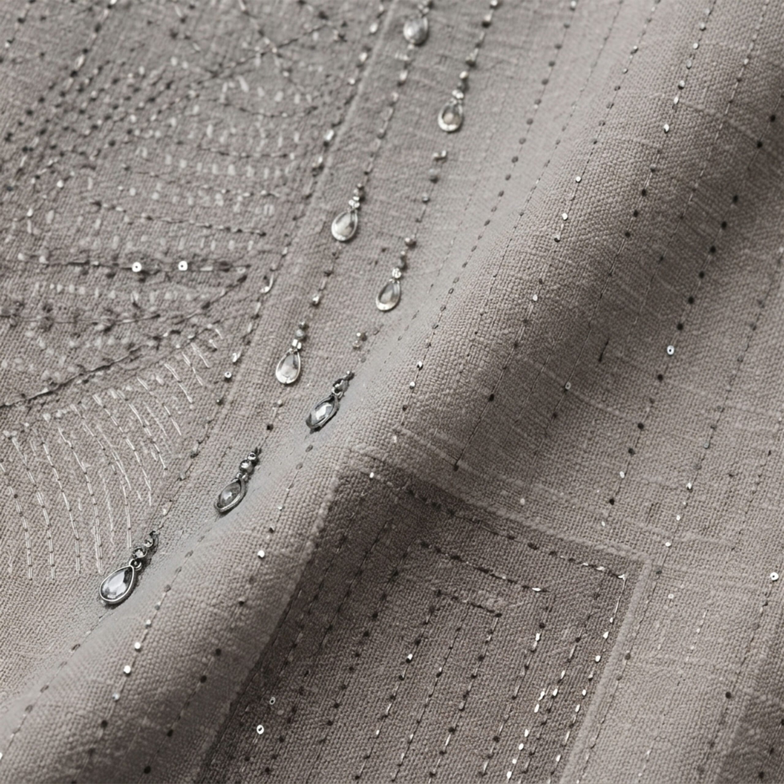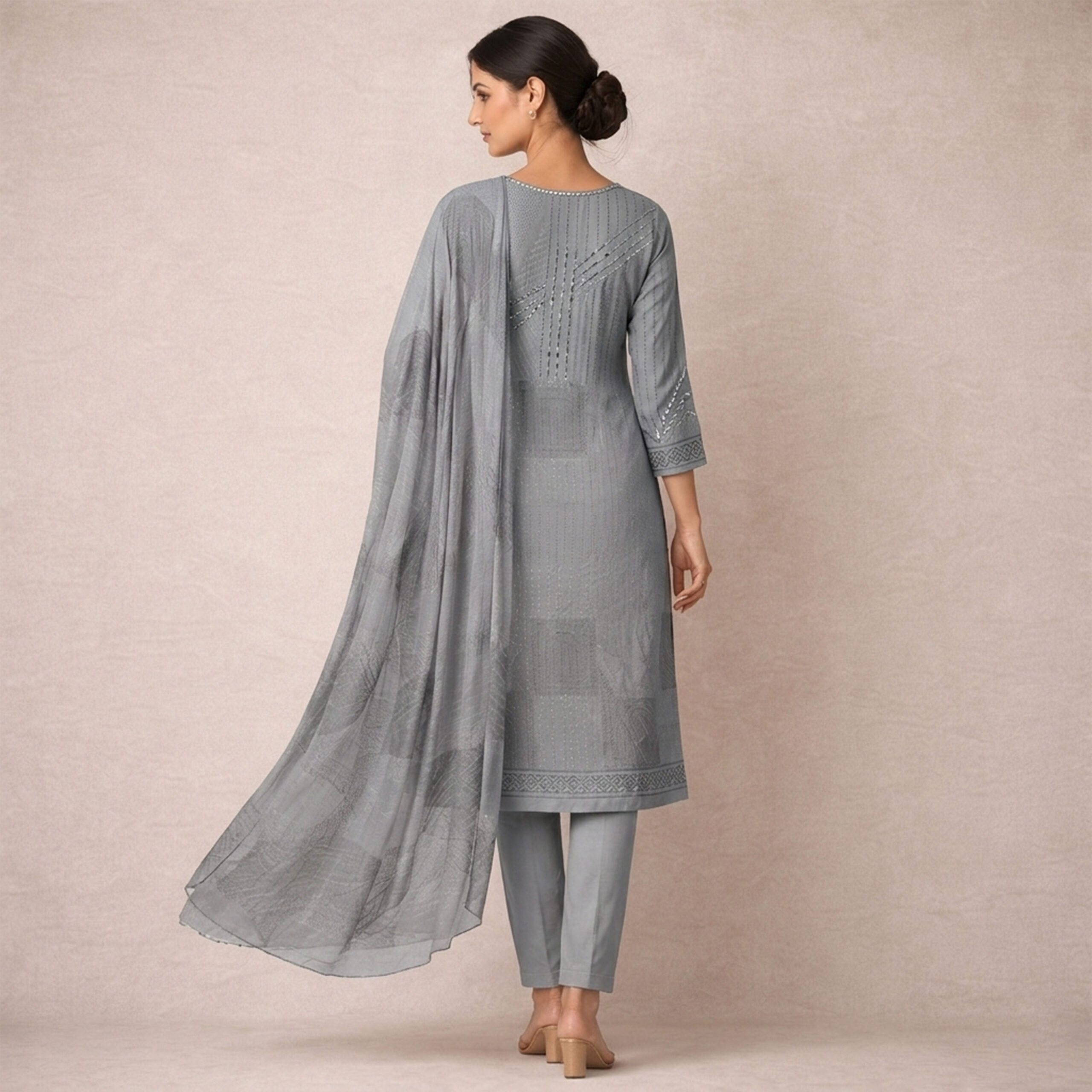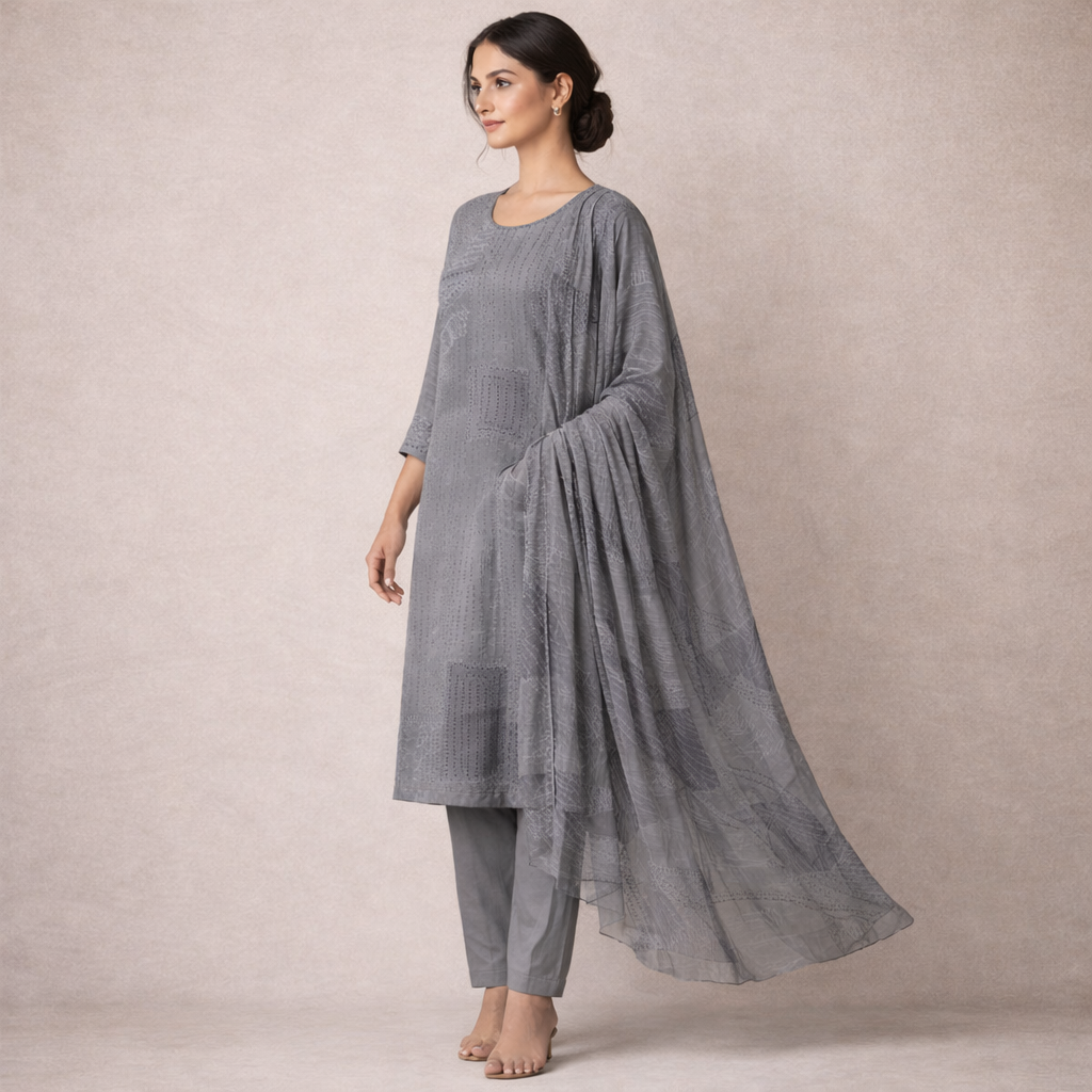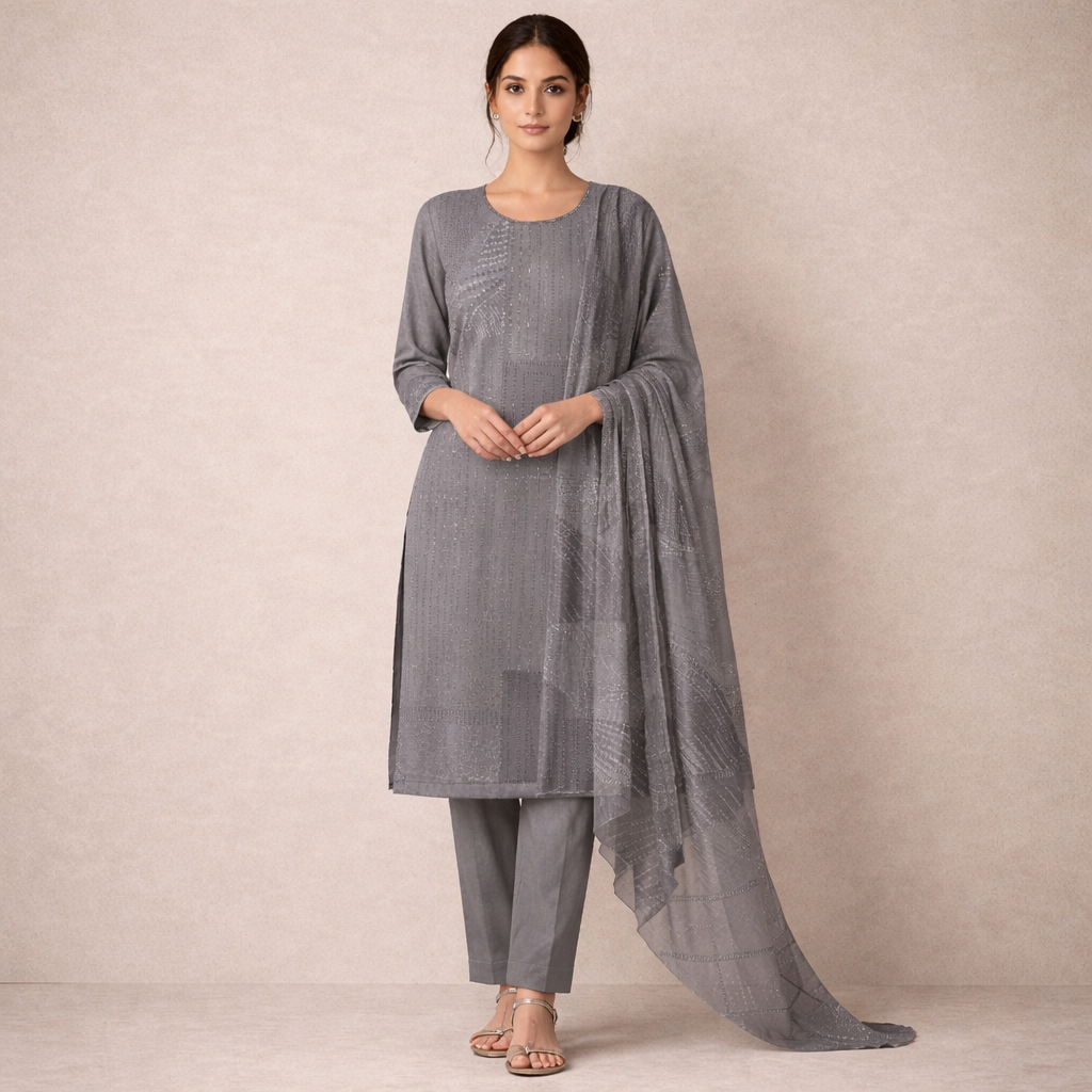 The sophisticated grey tone combined with delicate sequin and embroidery work creates a subtle yet luxurious appeal. The minimal design enhances its versatility, making it perfect for both festive occasions and elegant day wear.
