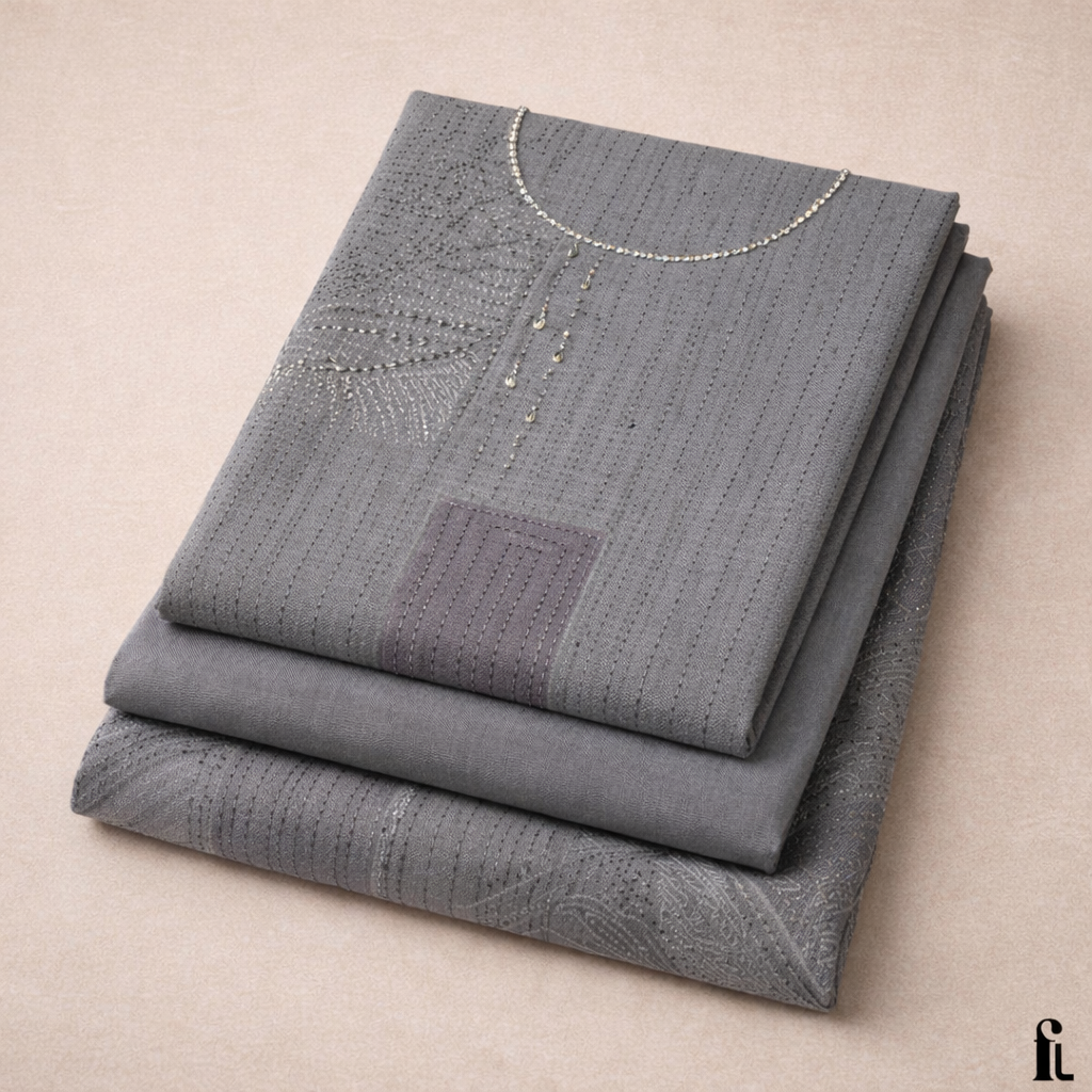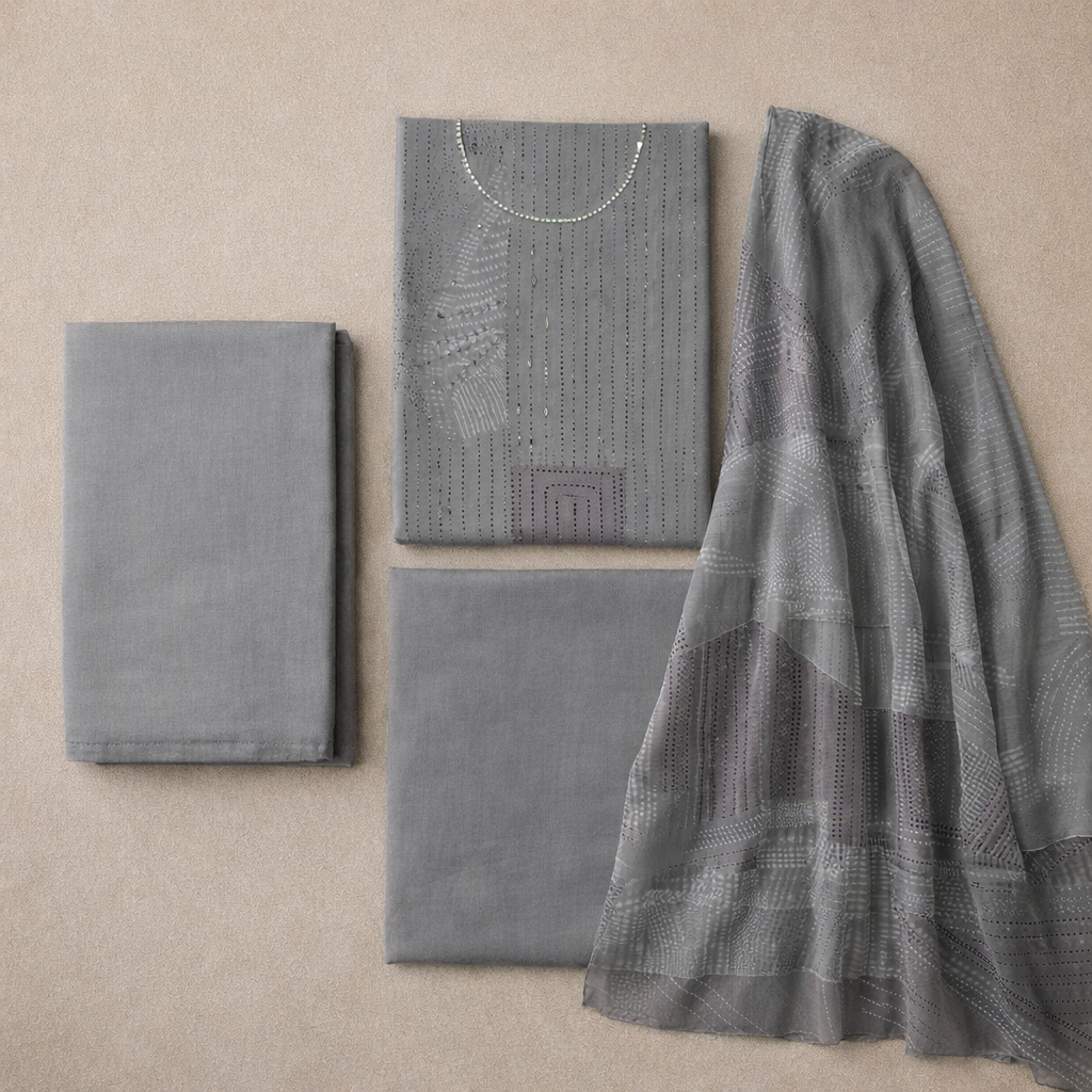 Step into refined elegance with this Fabloom Grey Embroidered Suit Set, designed for a premium and graceful look.