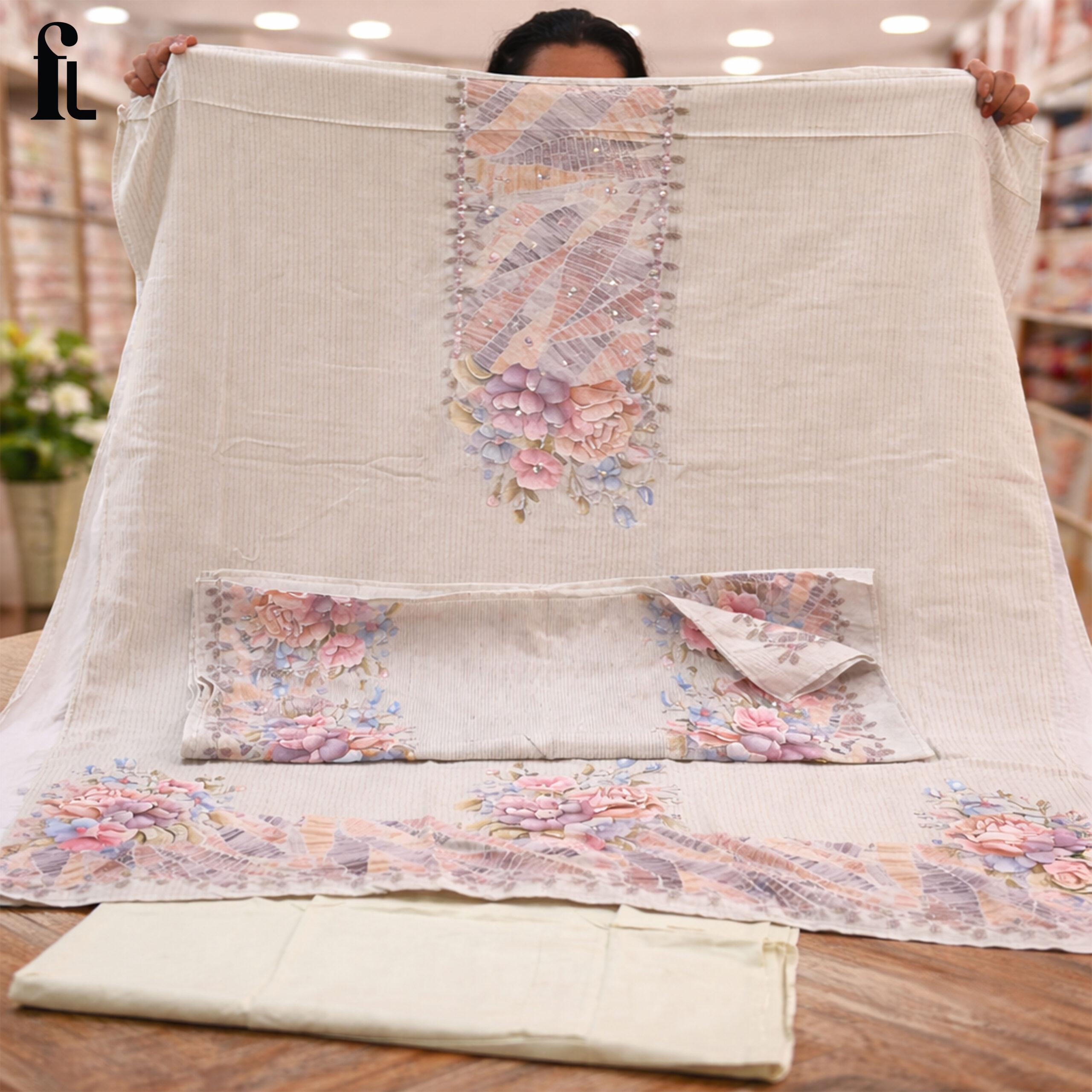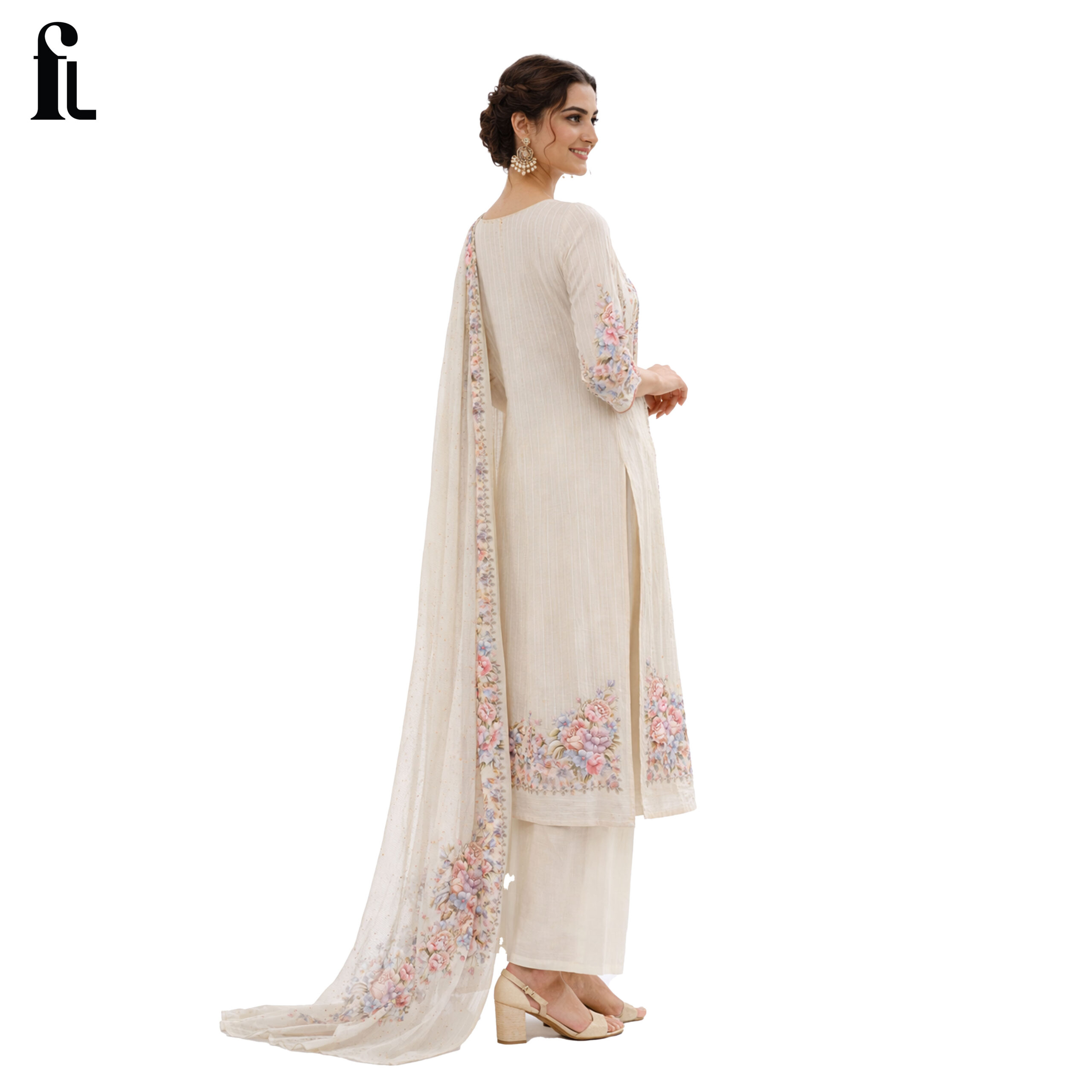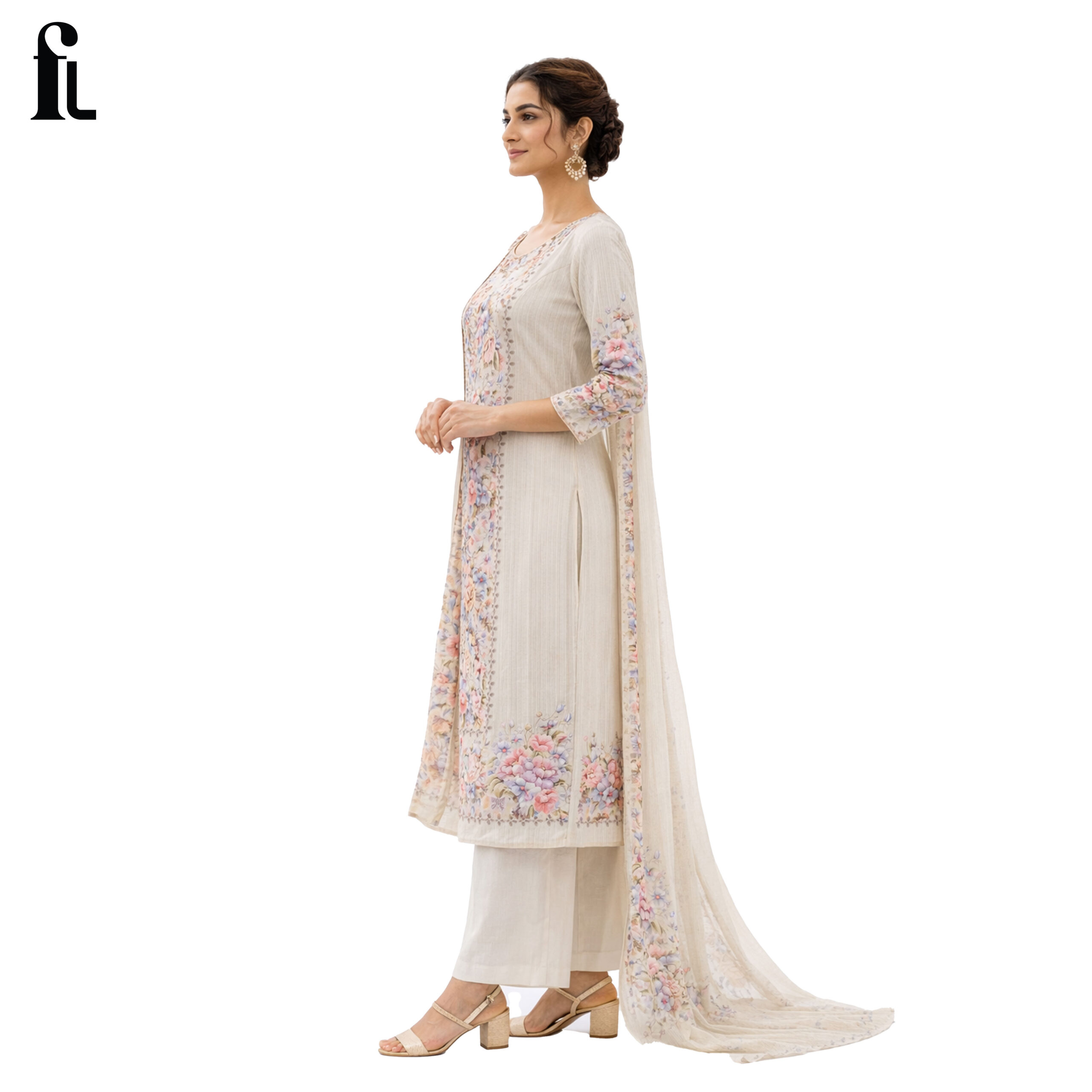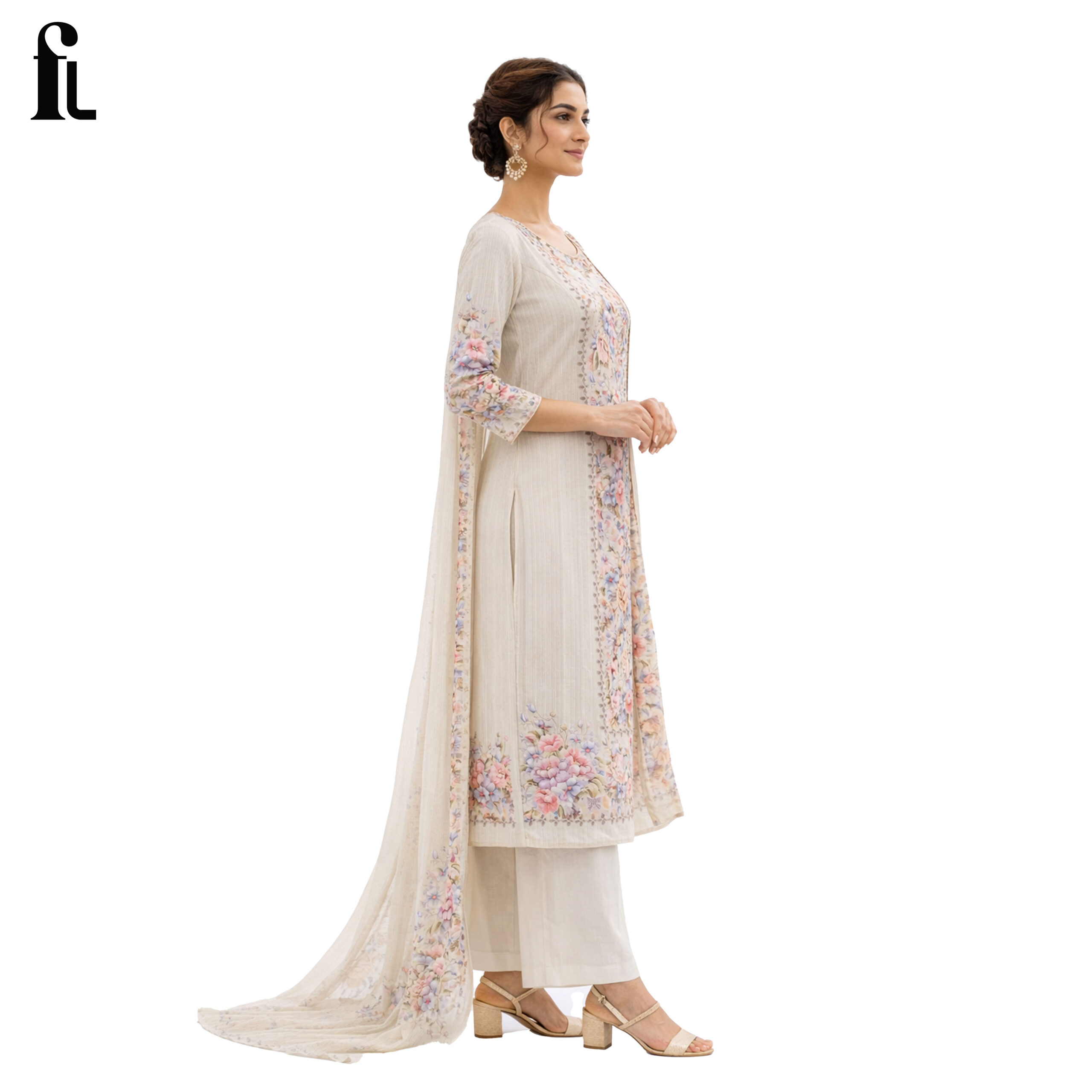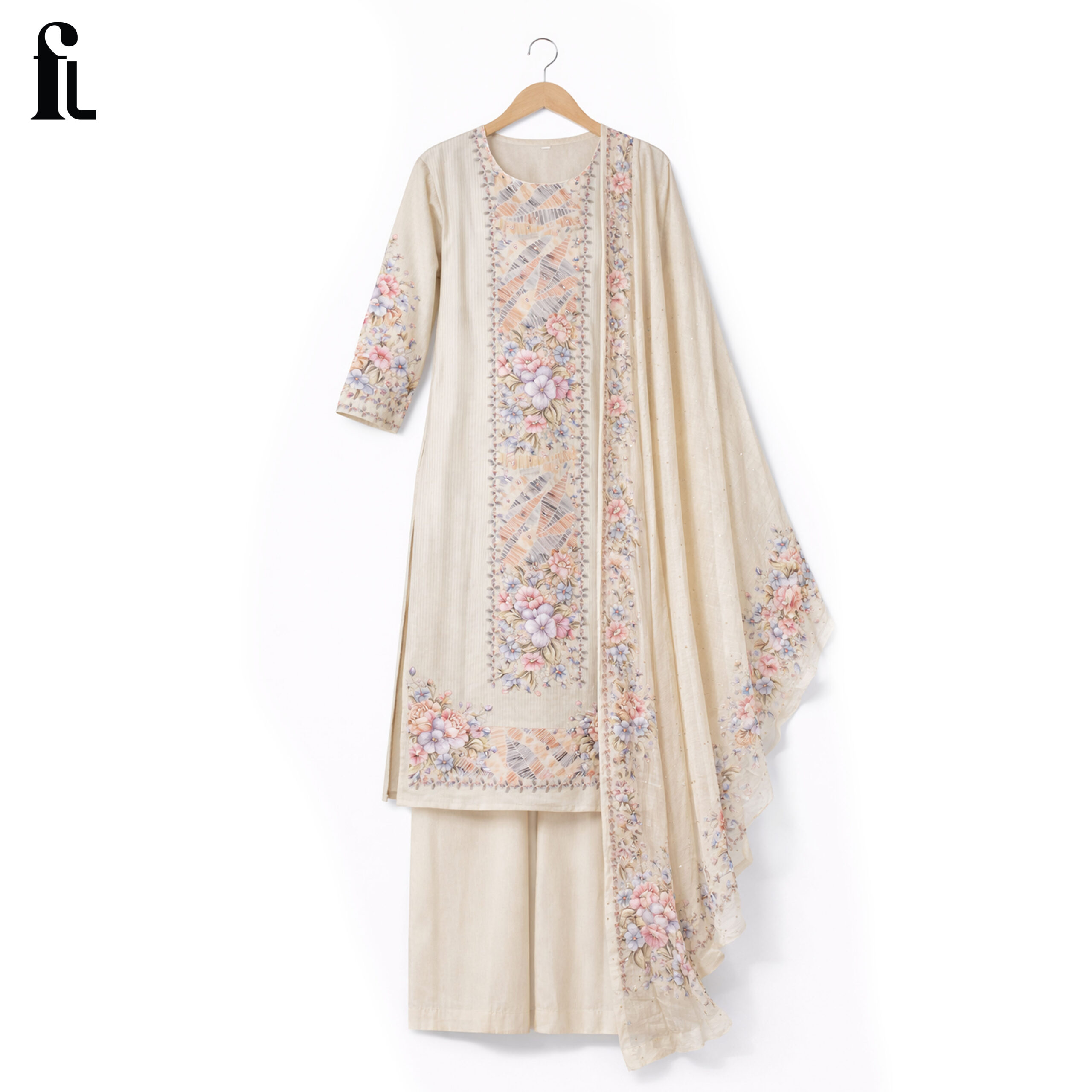 The soft ivory base beautifully complements delicate pastel floral prints, creating a refined and sophisticated look. Paired with a matching dupatta featuring coordinated floral borders, this outfit is perfect for daytime functions, festive gatherings, and elegant occasions.