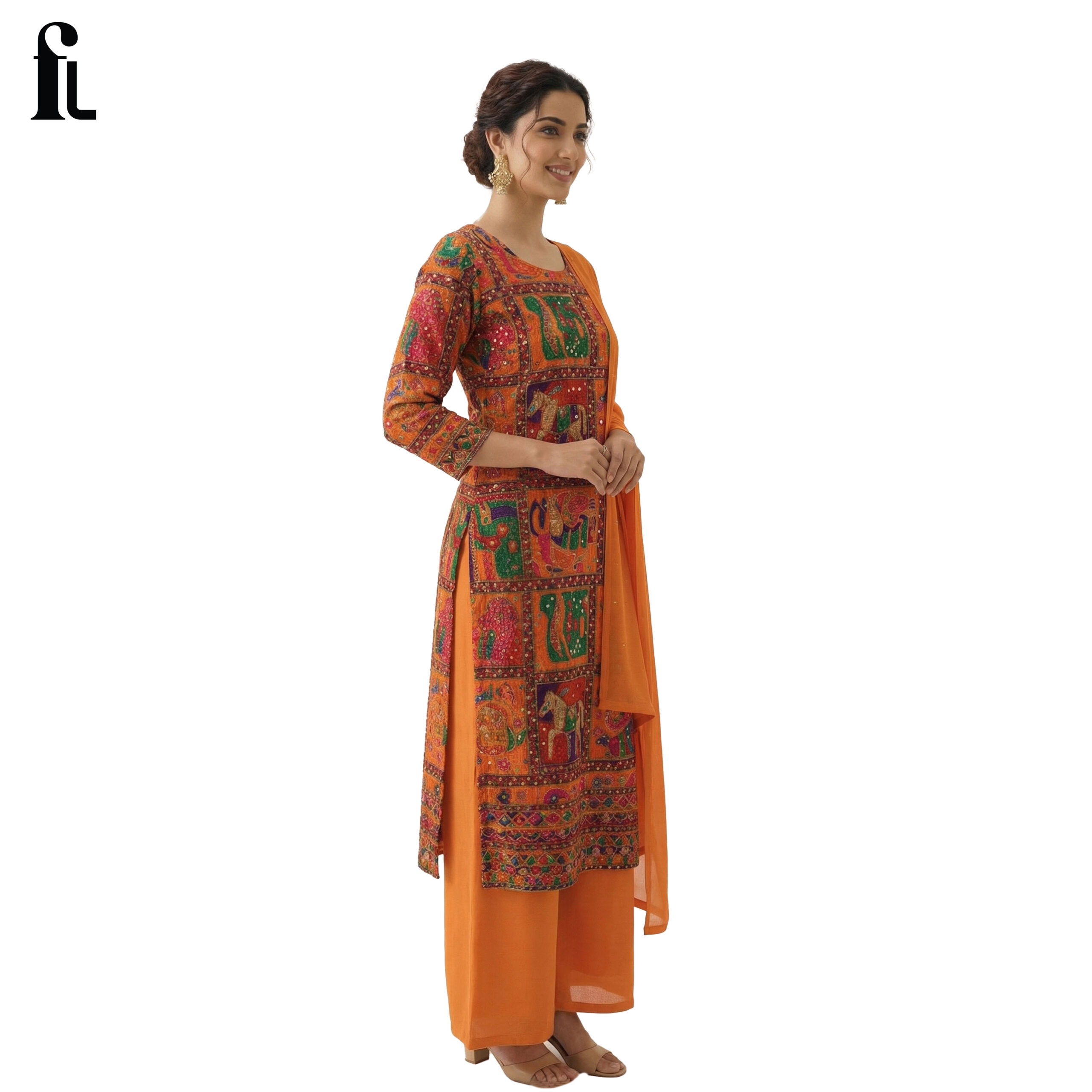 • Vibrant multicolor ethnic suit with traditional patchwork design & orange dupatta.