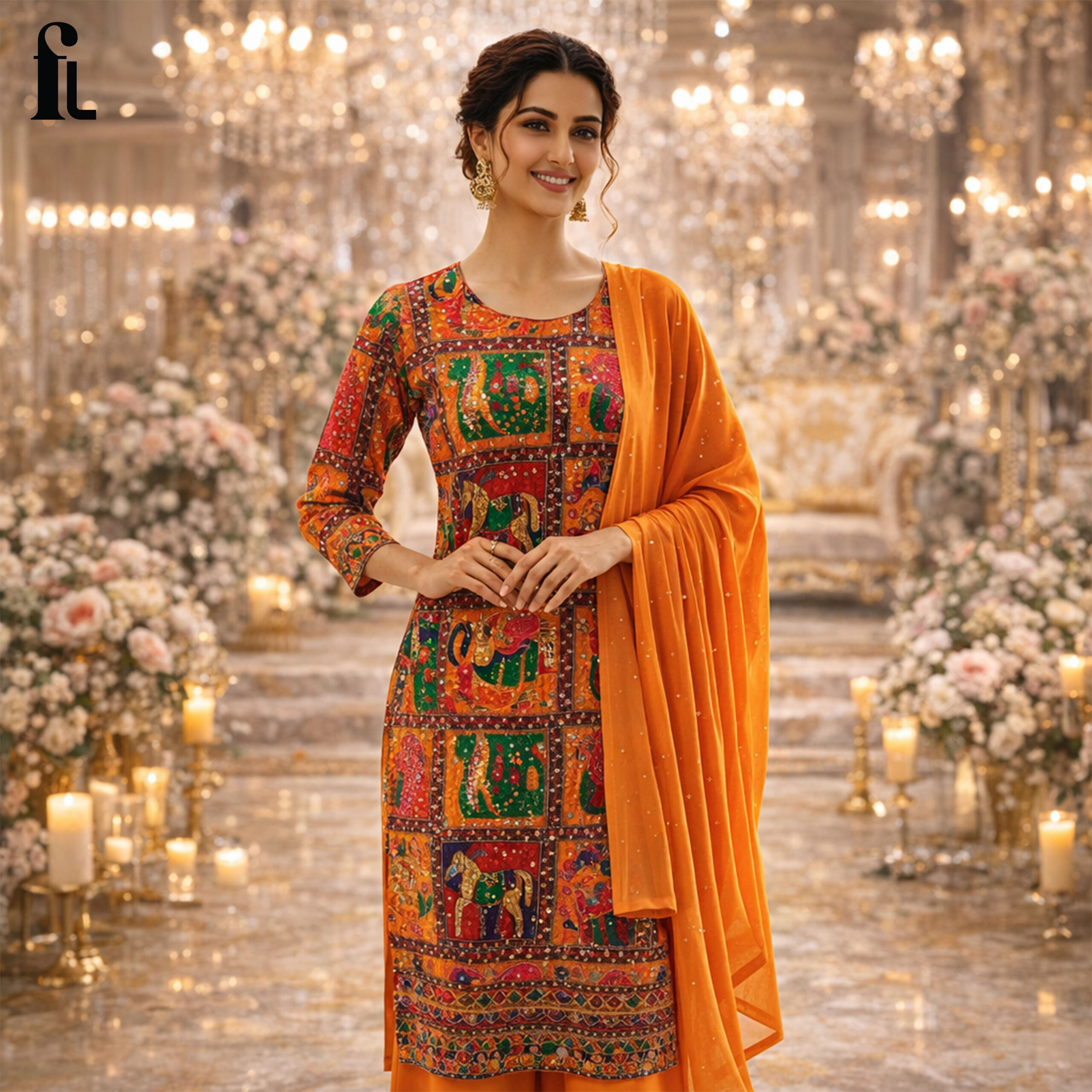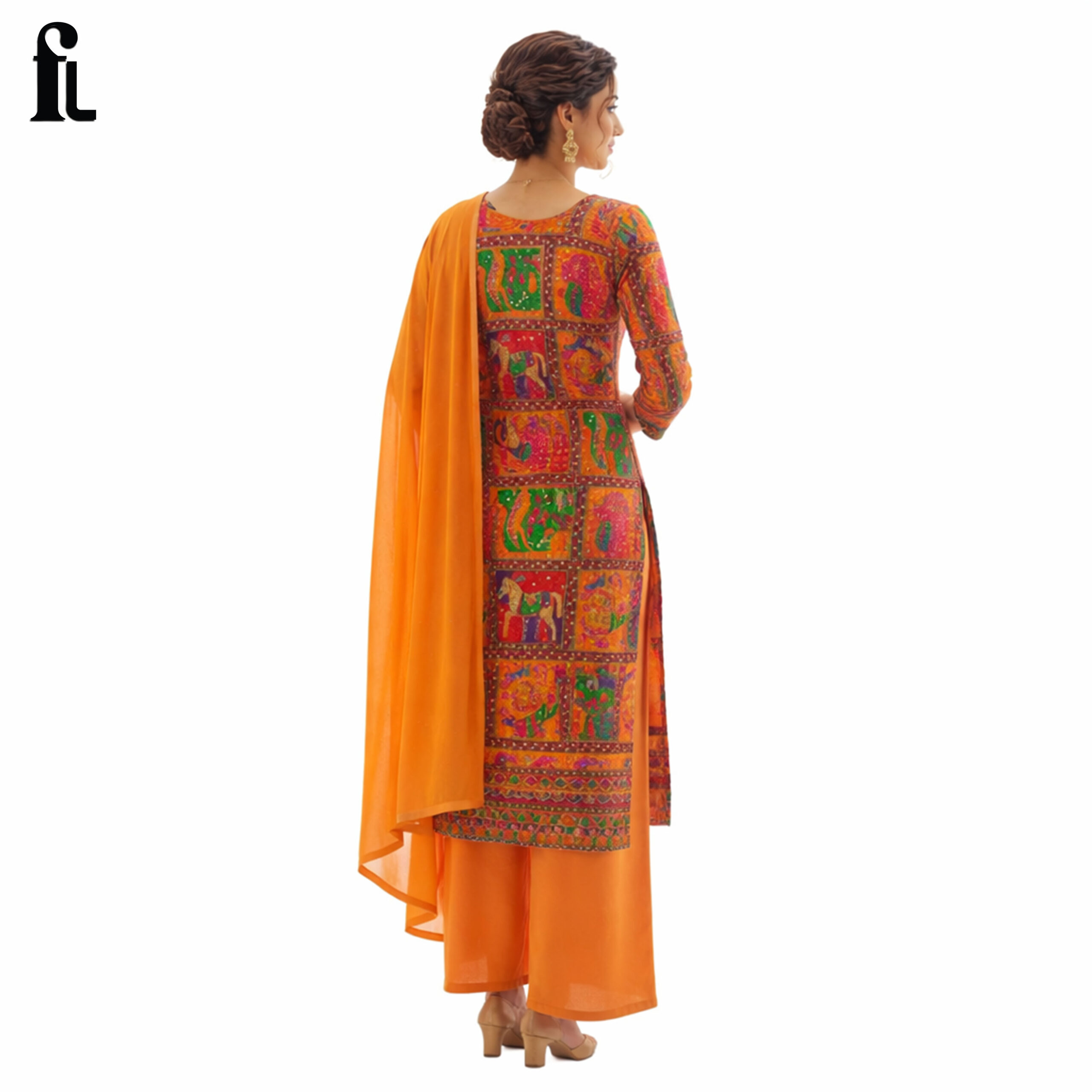 Designed with intricate ethnic motifs inspired by traditional artistry, this suit stands out with its colorful patchwork pattern that adds a festive and lively touch. Paired with a rich orange dupatta, it creates a perfect balance of elegance and brightness.