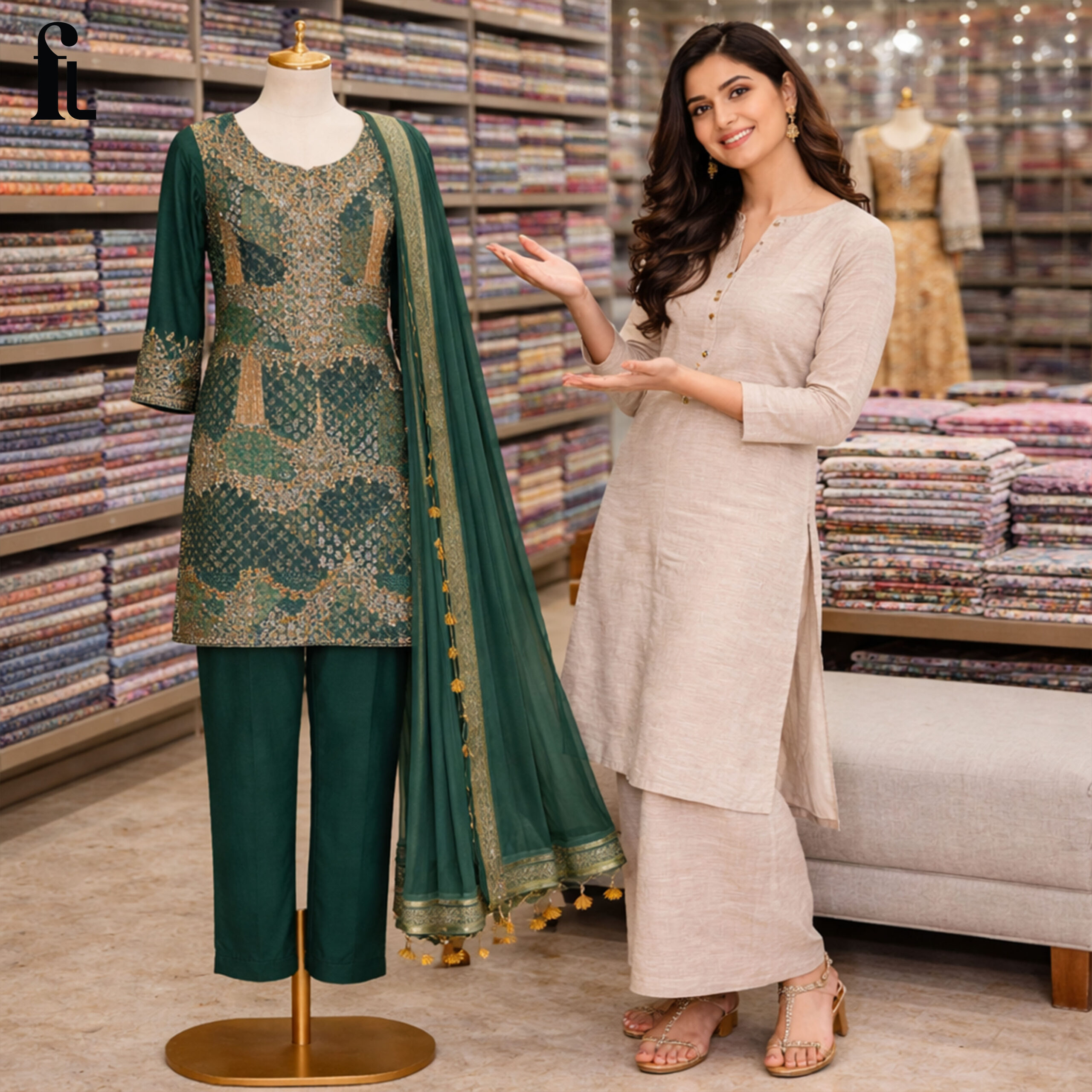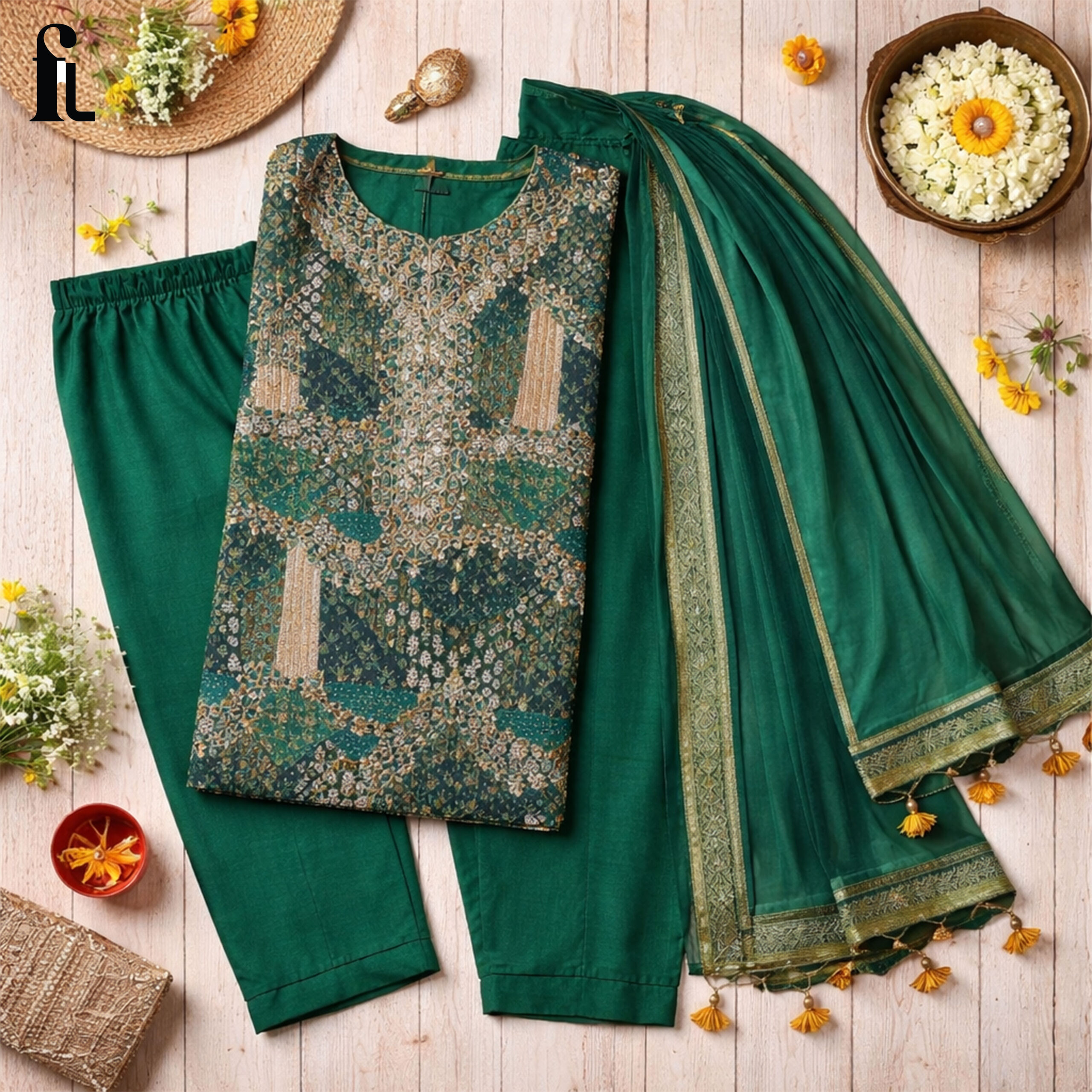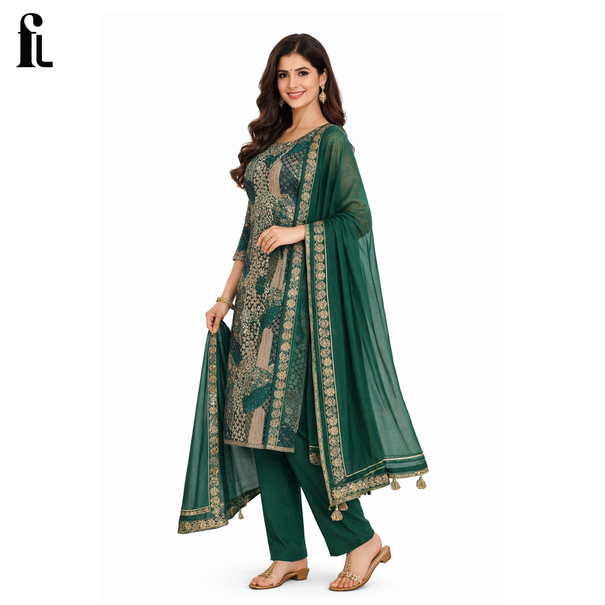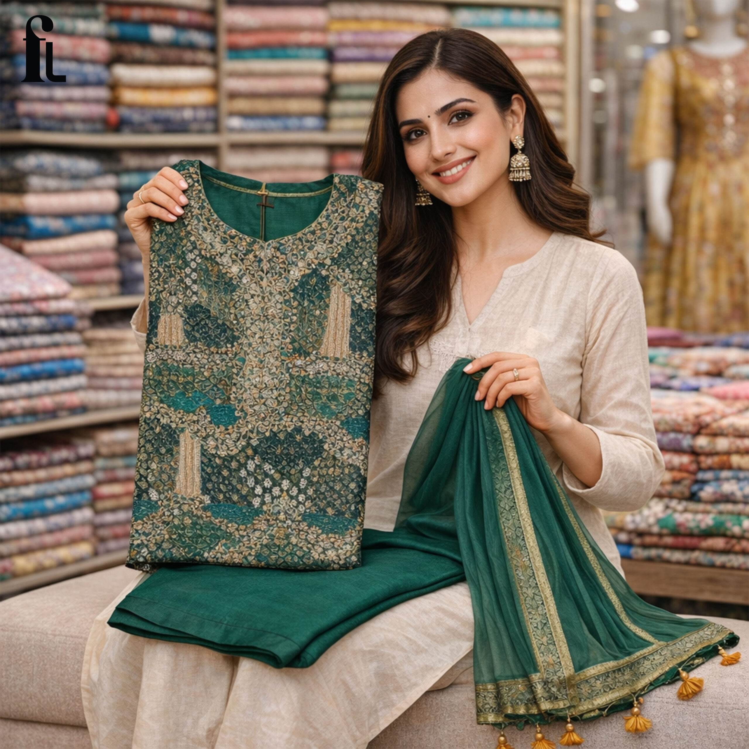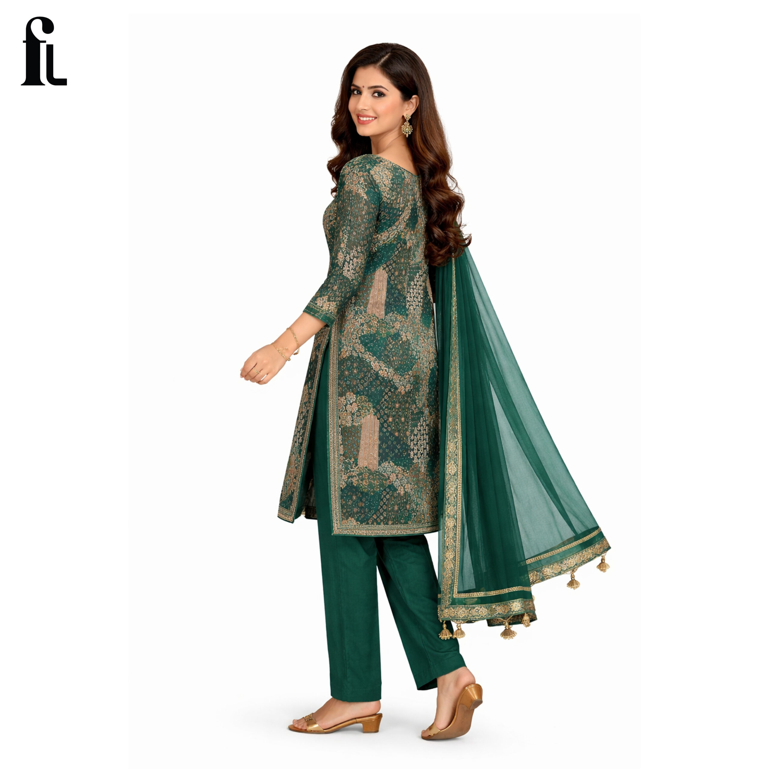 Upgrade your ethnic wardrobe with the Fabloom Premium Cotton Ethnic Suit Set in an elegant bottle green shade.