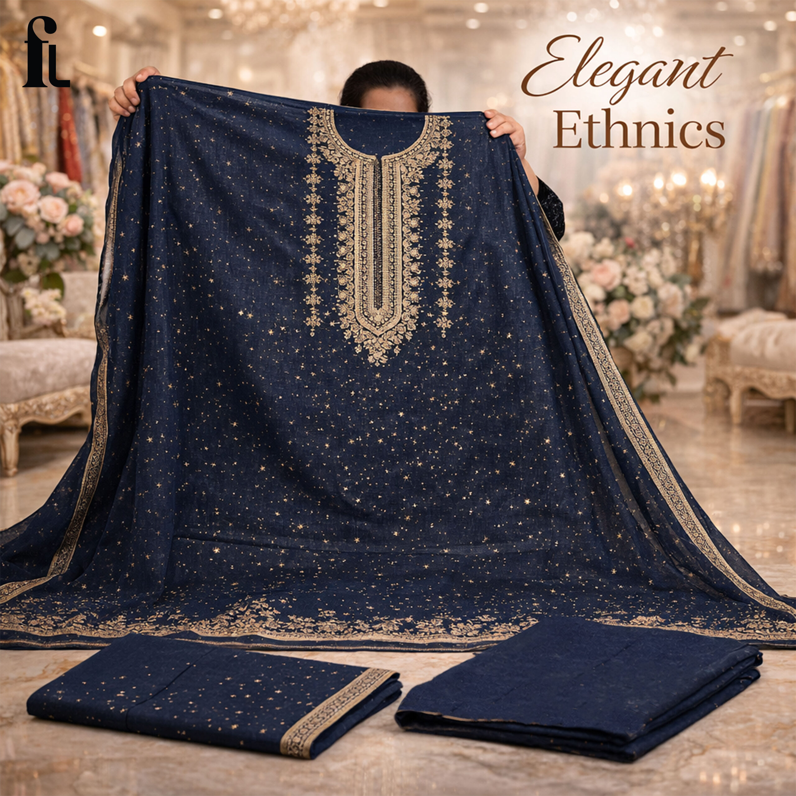Featuring intricate embroidery on the neckline and delicate detailing across the fabric, this suit brings a perfect balance of sophistication and festive charm. The deep navy blue tone enhances its premium appeal, making it ideal for celebrations, gatherings, and special occasions.