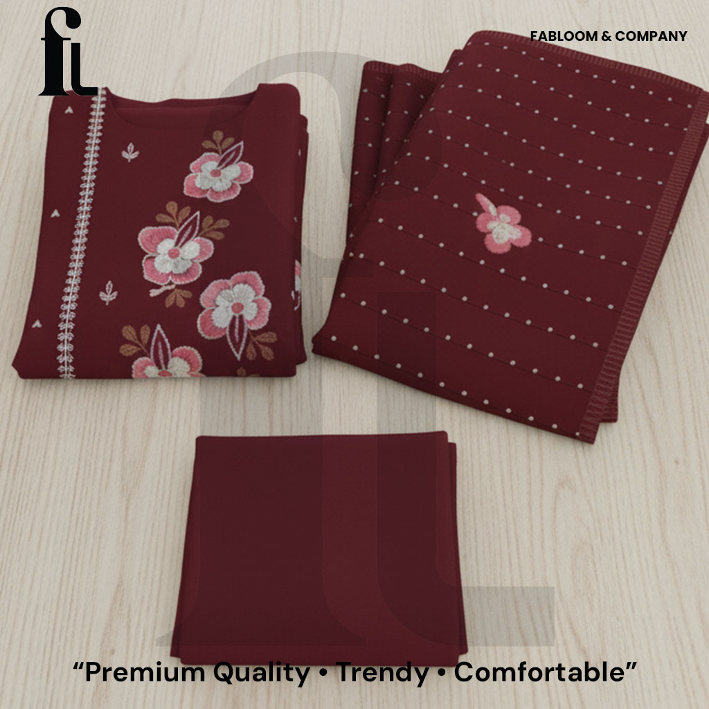 Refresh your ethnic collection with the Maroon Blossom Pure Cotton Unstitched Suit. Crafted from premium, breathable cotton, this ensemble features an elegant maroon base decorated with delicate pink and beige floral embroidery and beautifully finished borders. Its lightweight and soft texture promises maximum comfort, making this suit ideal for long summer days, festive gatherings, office wear, or casual outings. The unstitched design gives you the freedom to personalize the fit and style, ensuring both versatility and a custom silhouette. Durable and colorfast, this suit is a must-have for anyone looking for both charm and comfort in ethnic wear.​