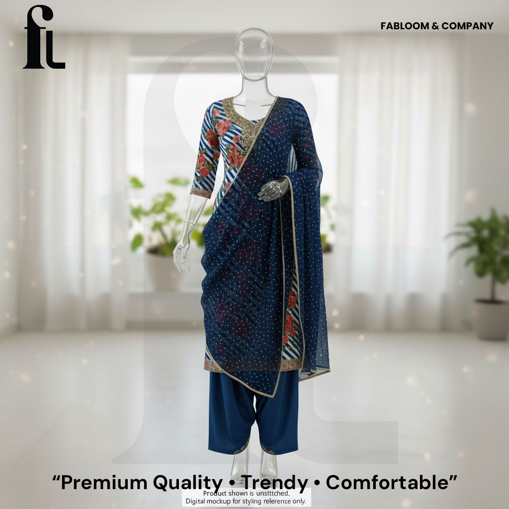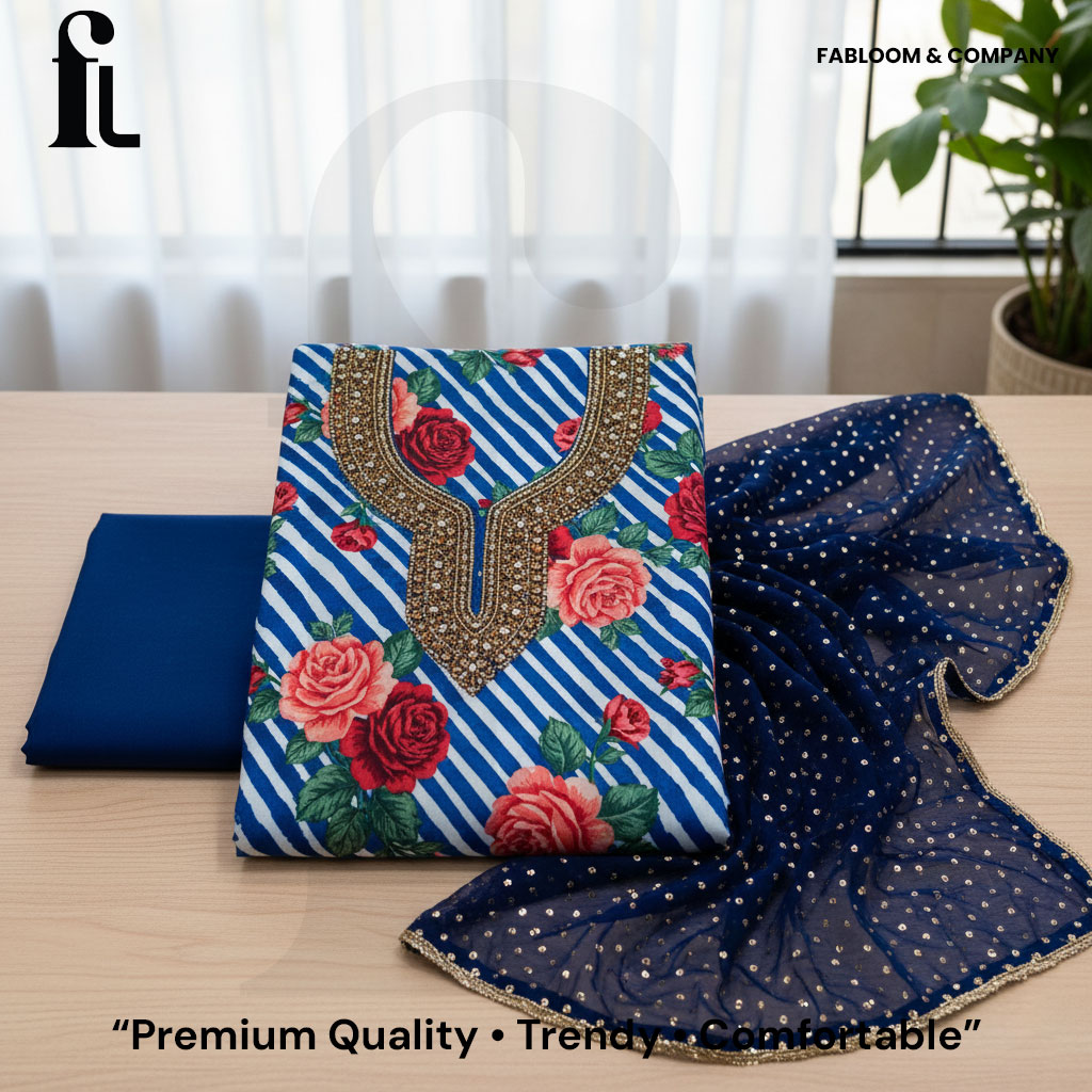 ntroduce timeless elegance into your wardrobe with the Royal Blue Floral Suit Set from Fabloom & Company. This premium unstitched ensemble is crafted from high-quality, breathable fabric, adorned with a vibrant rose floral pattern accented by stylish white stripes. The kurta’s neckline is enhanced with intricate golden embroidery and radiant beadwork, lending a regal touch to your look and making it perfect for festive events, wedding celebrations, or sophisticated casual outings.